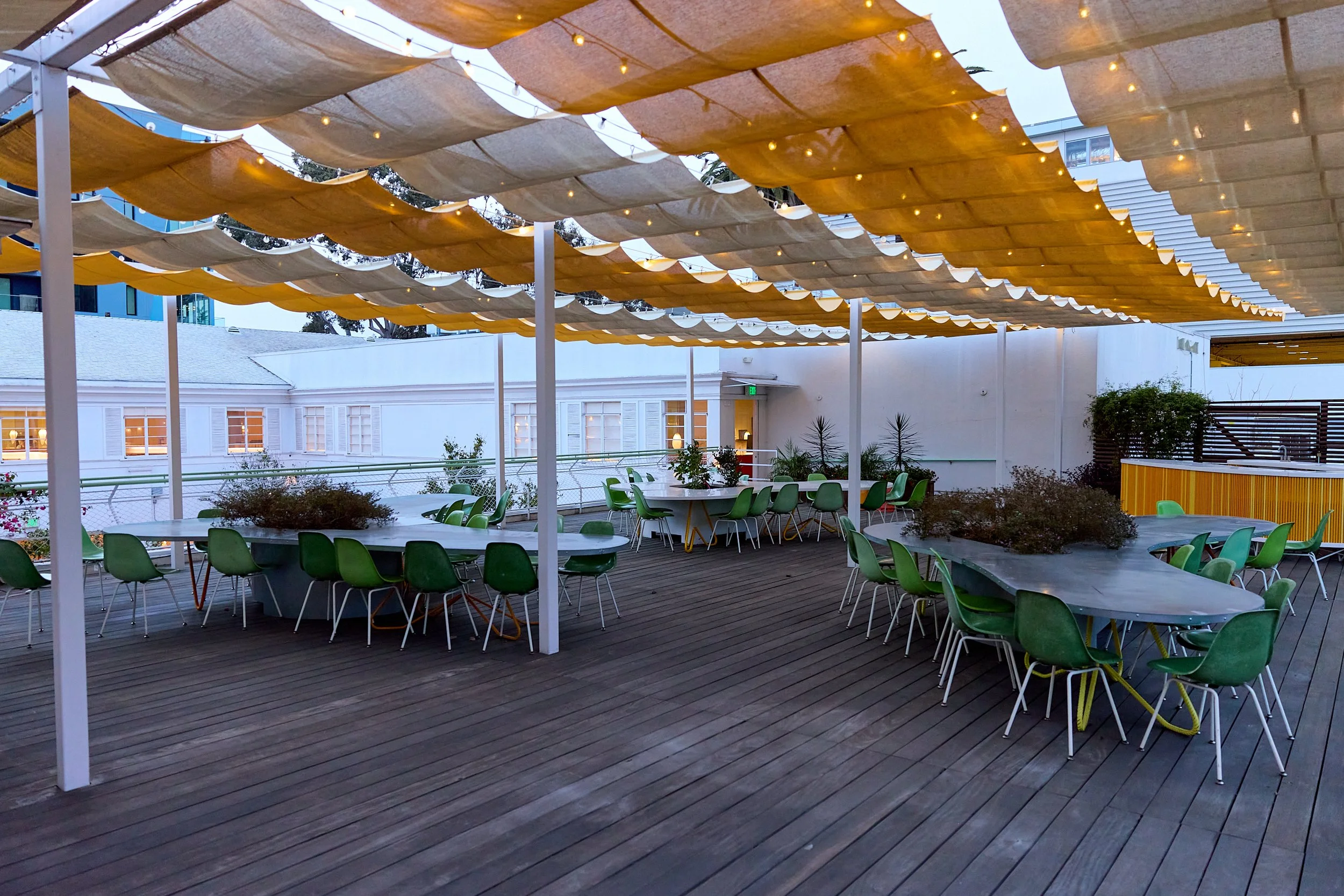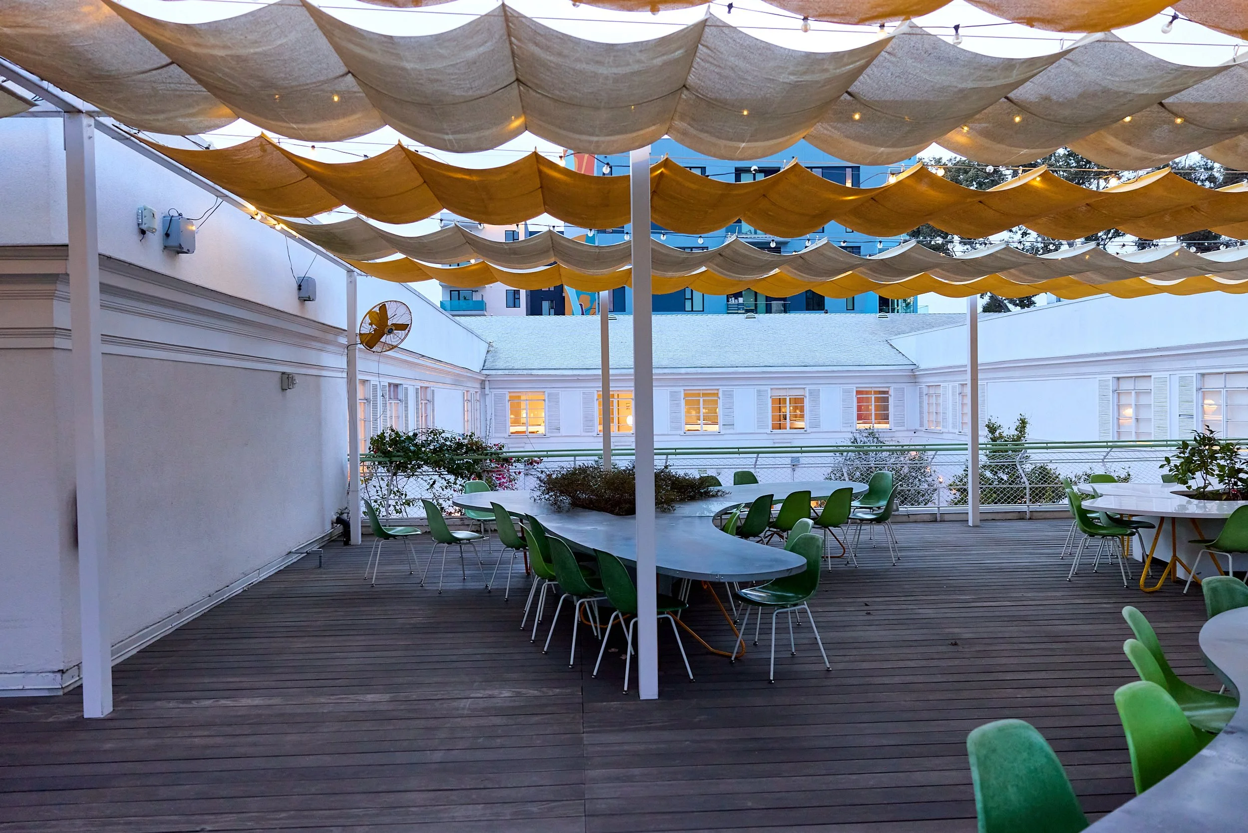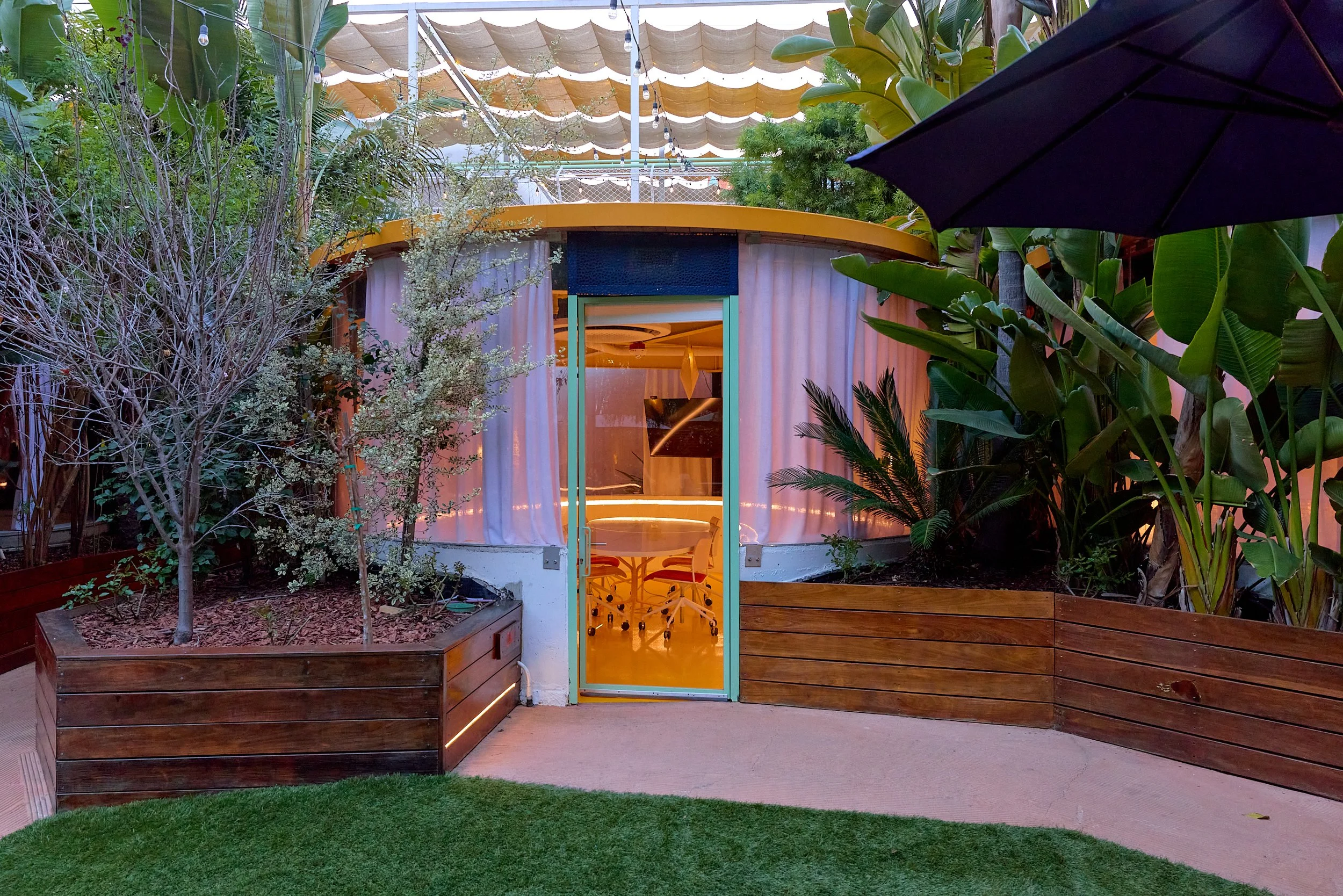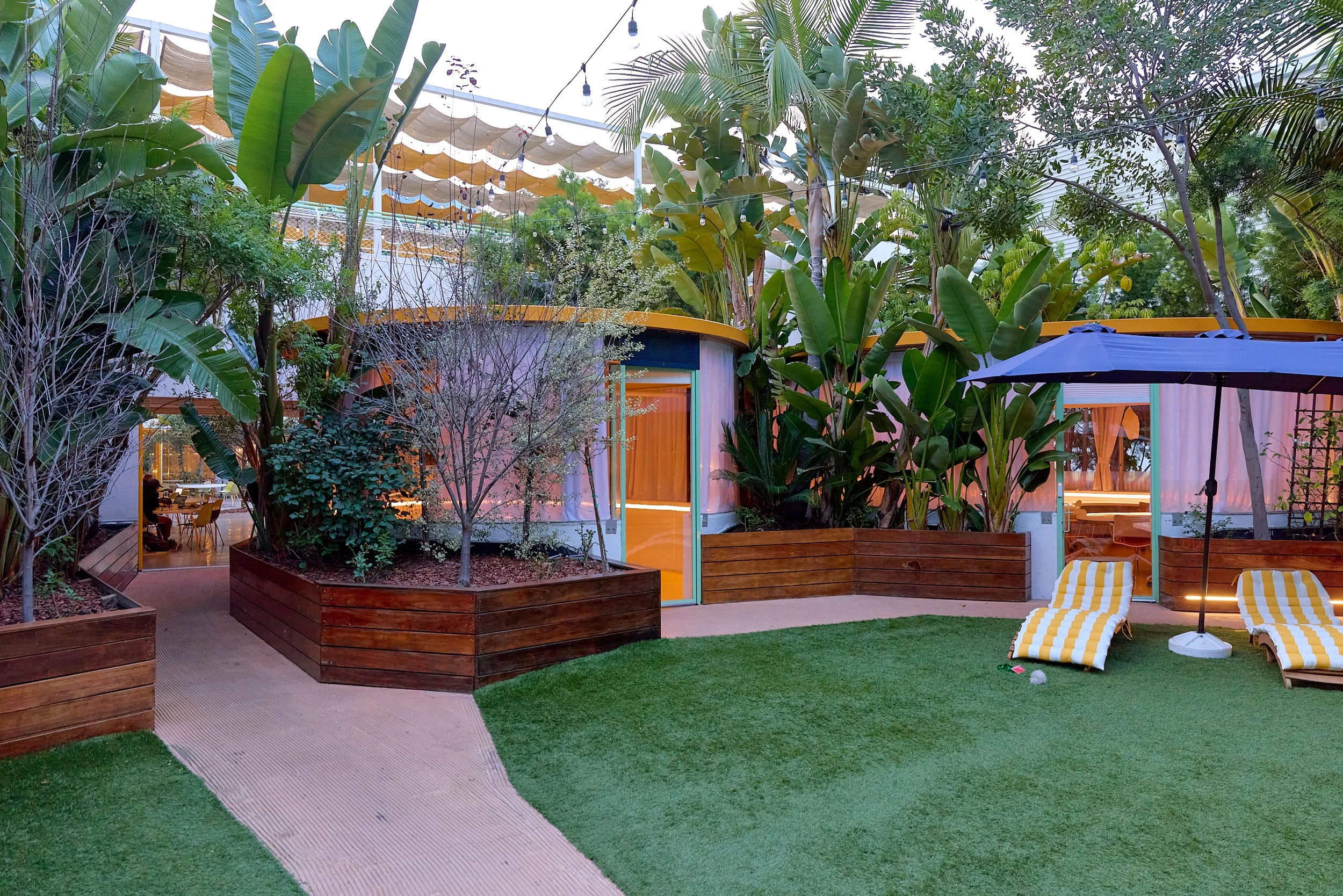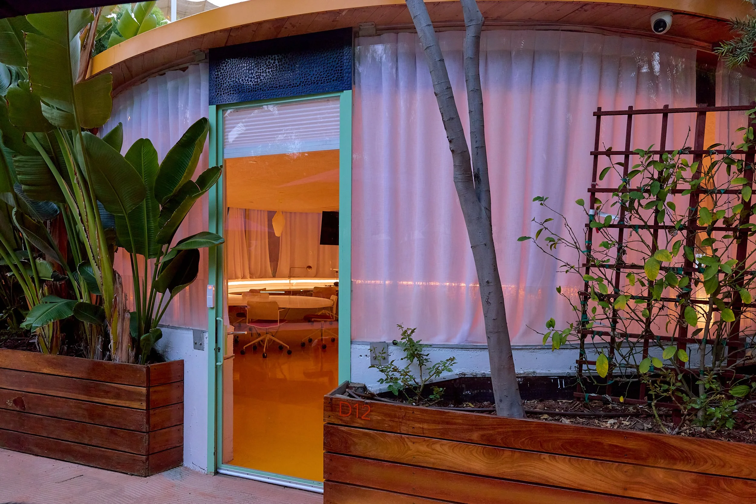 Two-acre creative campus designed by Spanish architect Jose Selgas (SelgasCano), integrated into a historic 1960s Paul Williams Colonial Revival office building. 50,000 sq ft landscaped garden 60 individual curved acrylic, freestanding garden studio office pods Restaurant and bar Tree-covered patio courtyard with fountain Auditorium Meeting rooms and breakout spaces Private offices On-site bookshop Interconnected pathways throughout campus Architecturally distinct: Mid-Century structure paired with contemporary Bauhaus-influenced design and futuristic acrylic pod installations Extensive natural light, layered outdoor environments, and multiple self-contained zones within one controlled campus setting.
