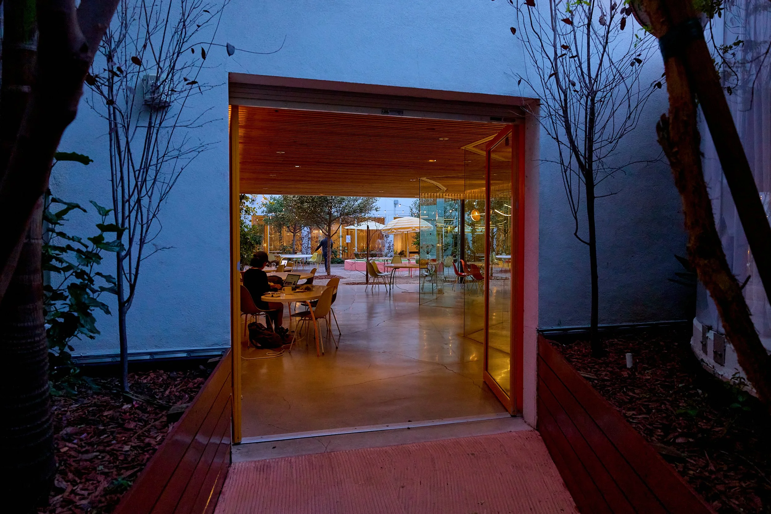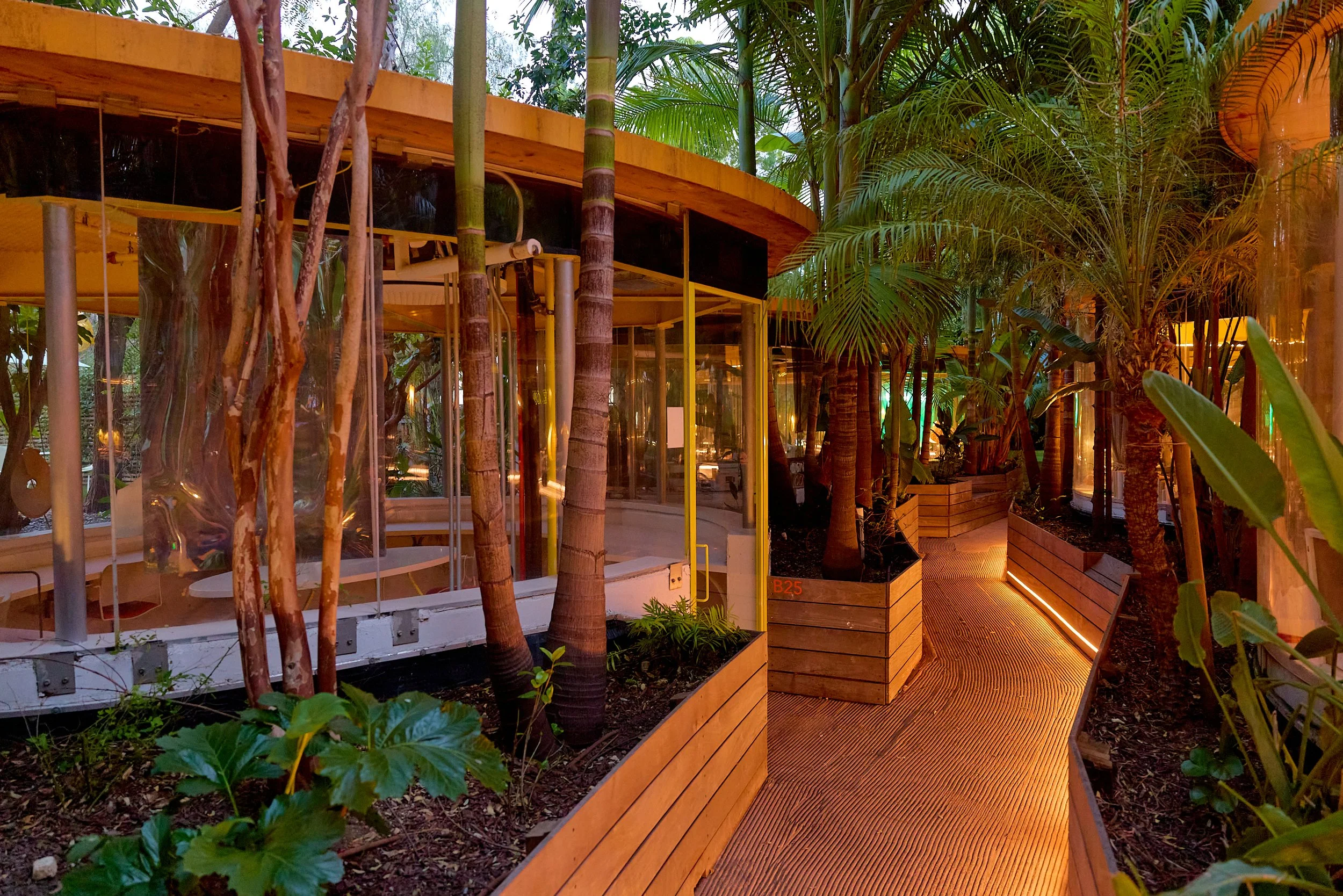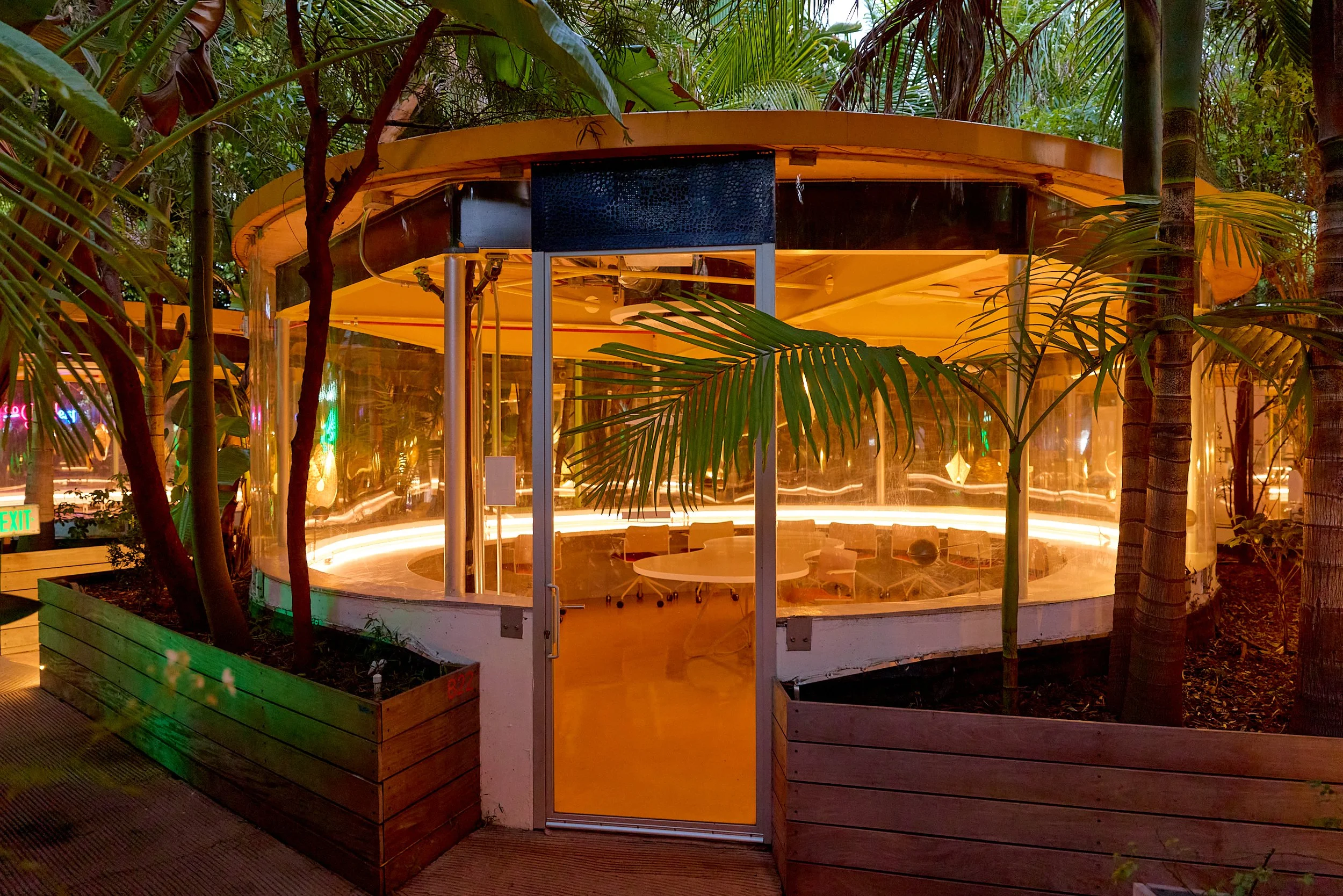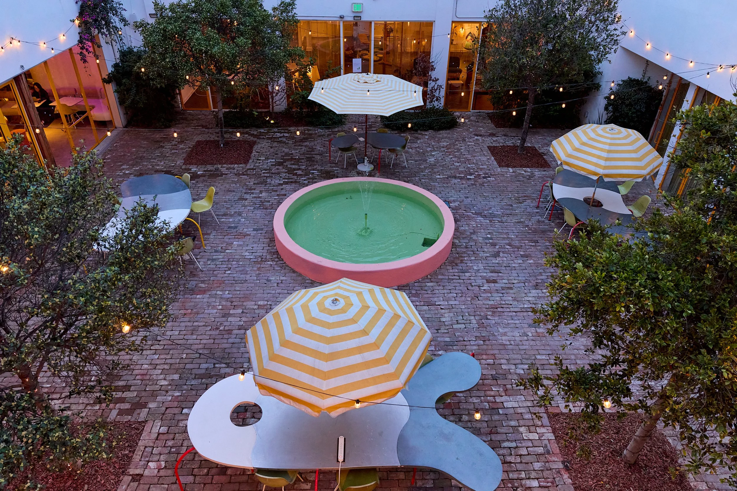 Two-acre creative campus designed by Spanish architect Jose Selgas (SelgasCano), integrated into a historic 1960s Paul Williams Colonial Revival office building. 50,000 sq ft landscaped garden 60 individual curved acrylic, freestanding garden studio office pods Restaurant and bar Tree-covered patio courtyard with fountain Auditorium Meeting rooms and breakout spaces Private offices On-site bookshop Interconnected pathways throughout campus Architecturally distinct: Mid-Century structure paired with contemporary Bauhaus-influenced design and futuristic acrylic pod installations Extensive natural light, layered outdoor environments, and multiple self-contained zones within one controlled campus setting.