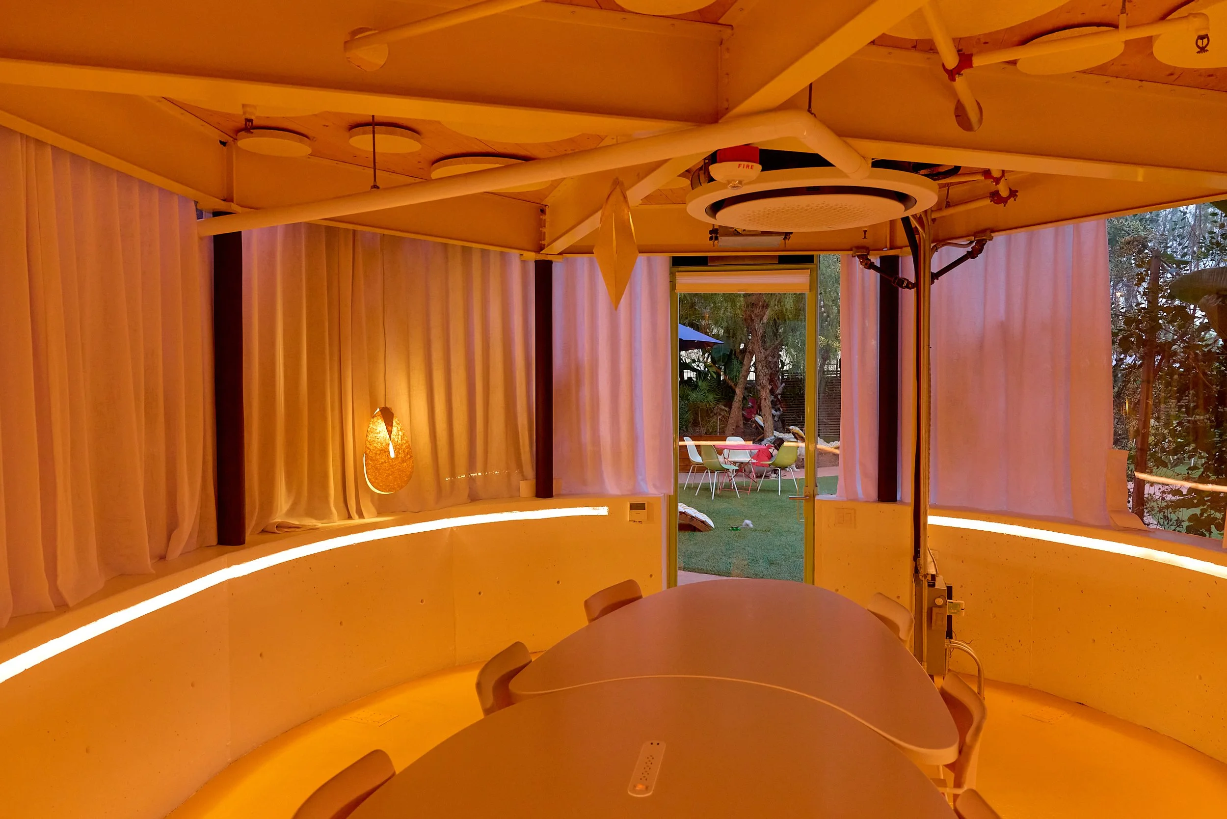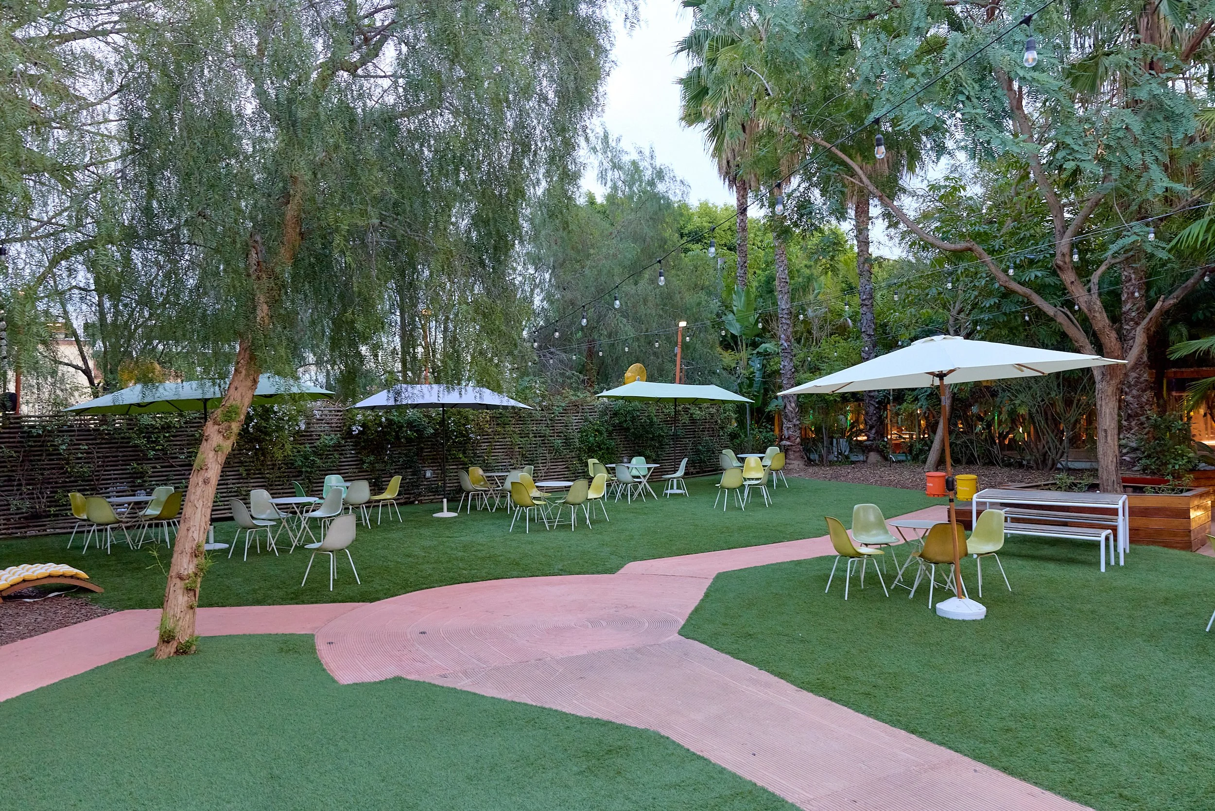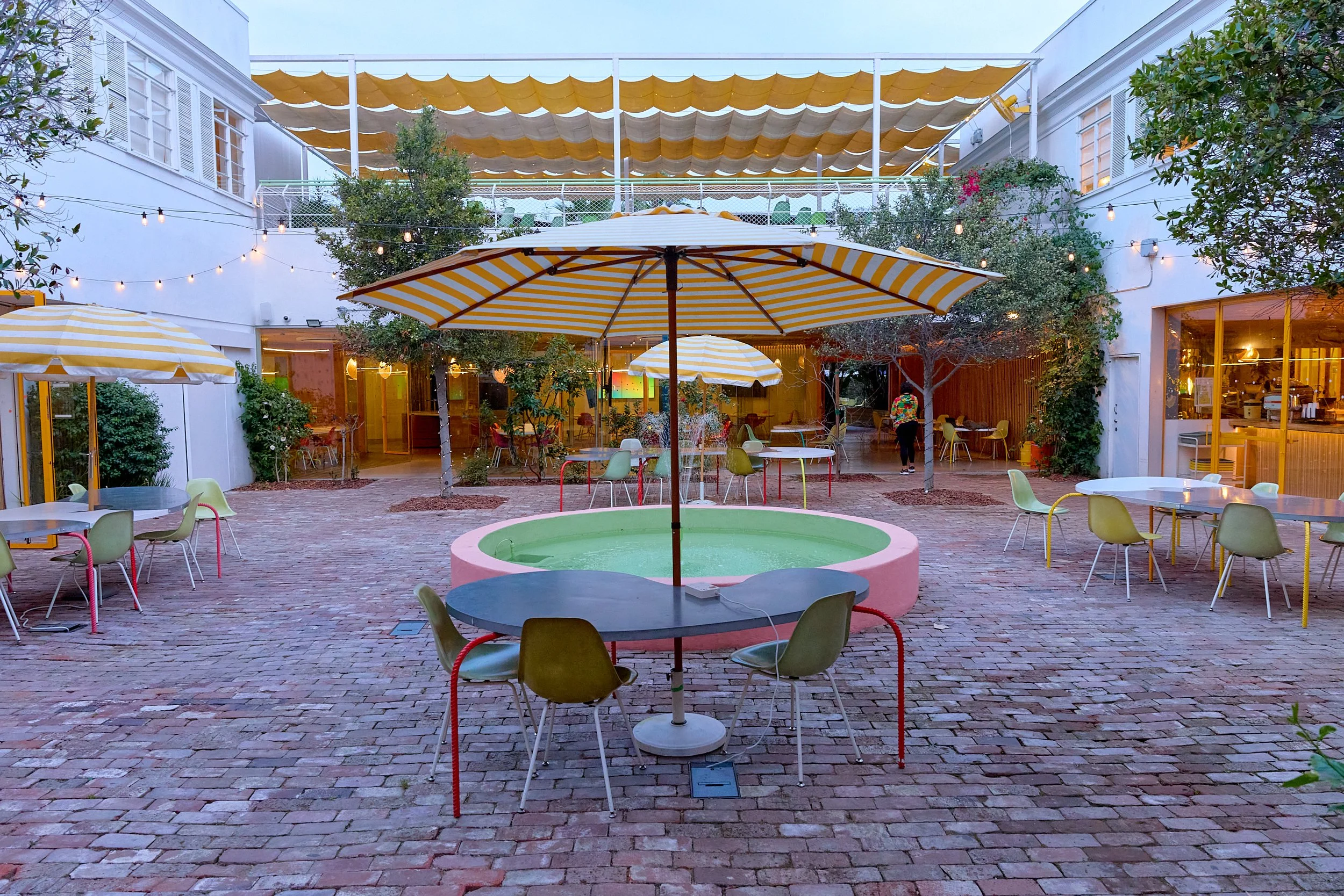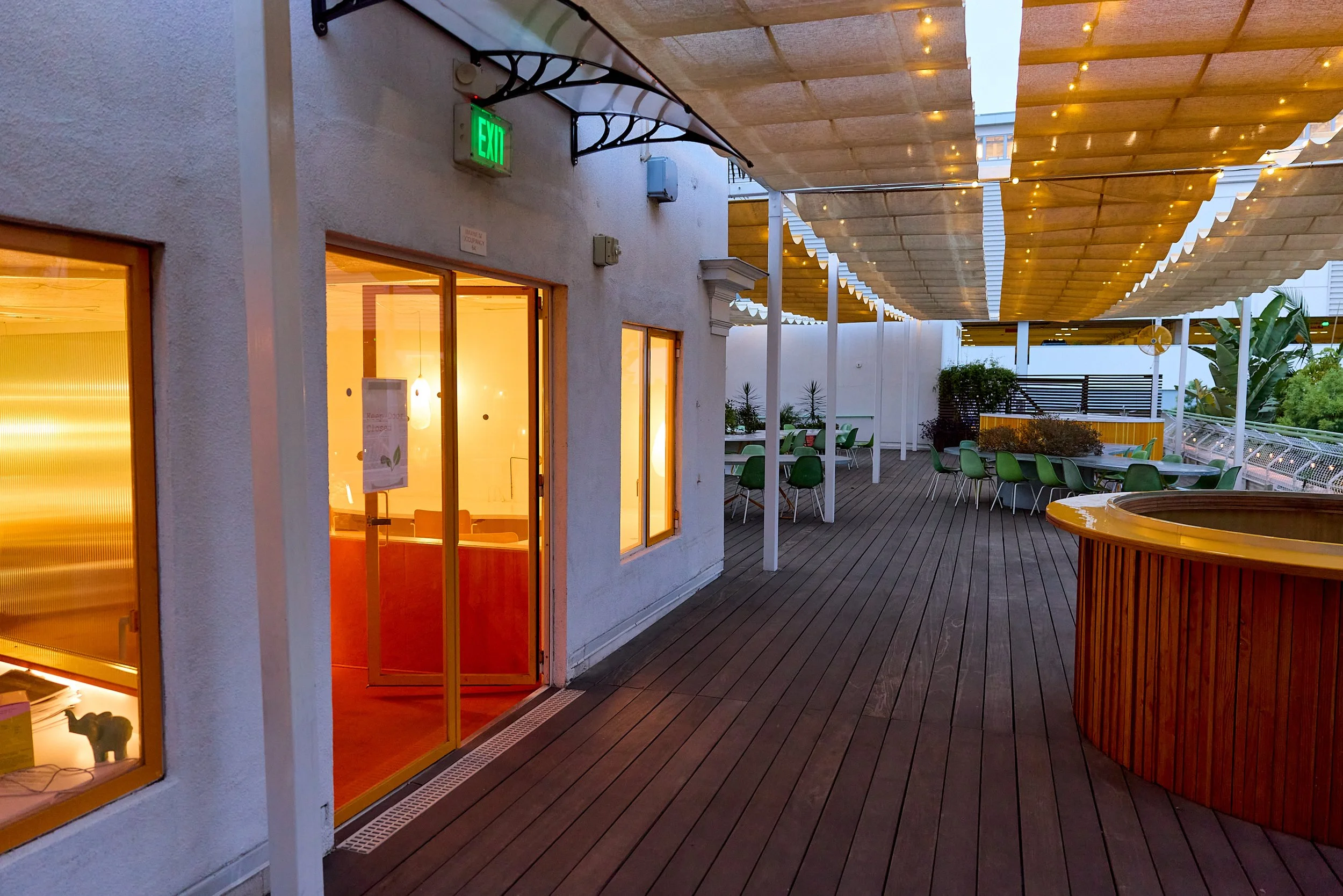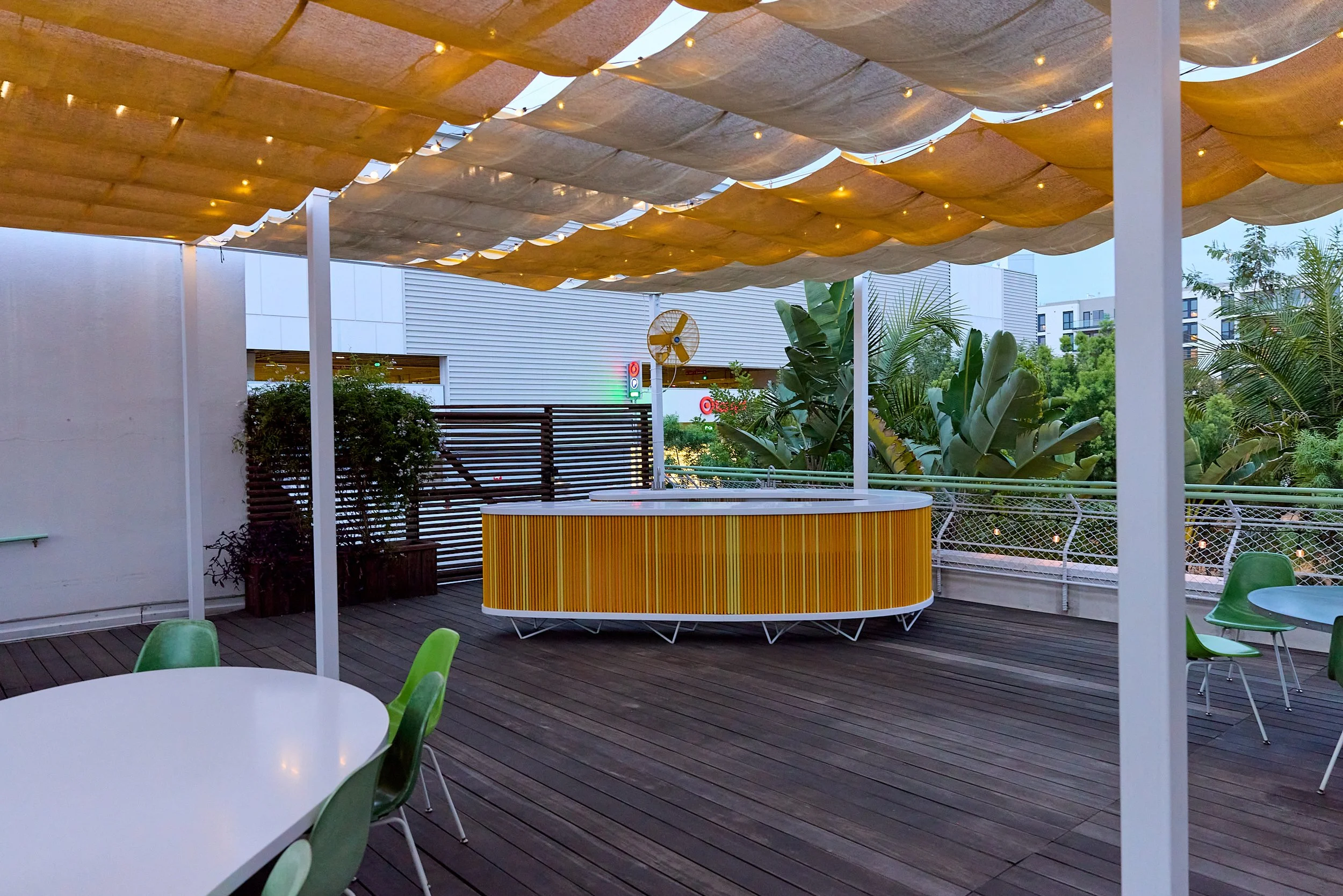 Two-acre creative campus designed by Spanish architect Jose Selgas (SelgasCano), integrated into a historic 1960s Paul Williams Colonial Revival office building. 50,000 sq ft landscaped garden 60 individual curved acrylic, freestanding garden studio office pods Restaurant and bar Tree-covered patio courtyard with fountain Auditorium Meeting rooms and breakout spaces Private offices On-site bookshop Interconnected pathways throughout campus Architecturally distinct: Mid-Century structure paired with contemporary Bauhaus-influenced design and futuristic acrylic pod installations Extensive natural light, layered outdoor environments, and multiple self-contained zones within one controlled campus setting.