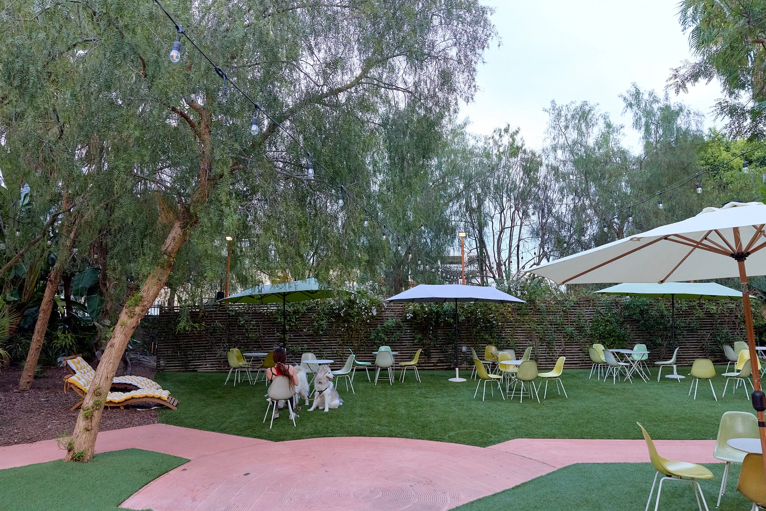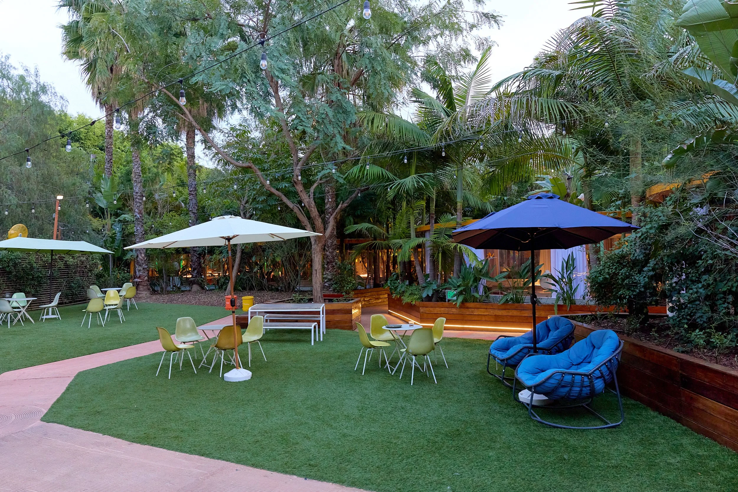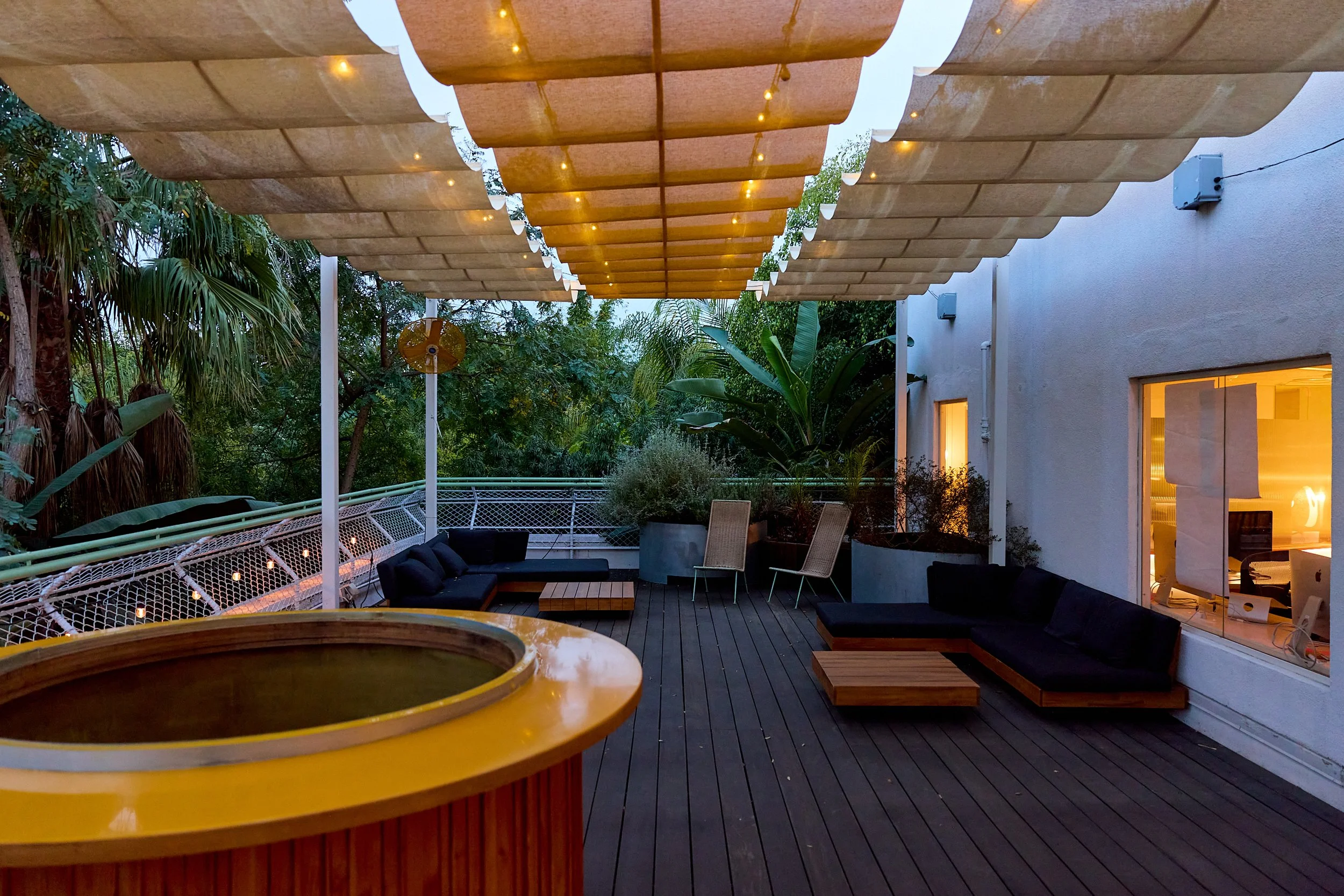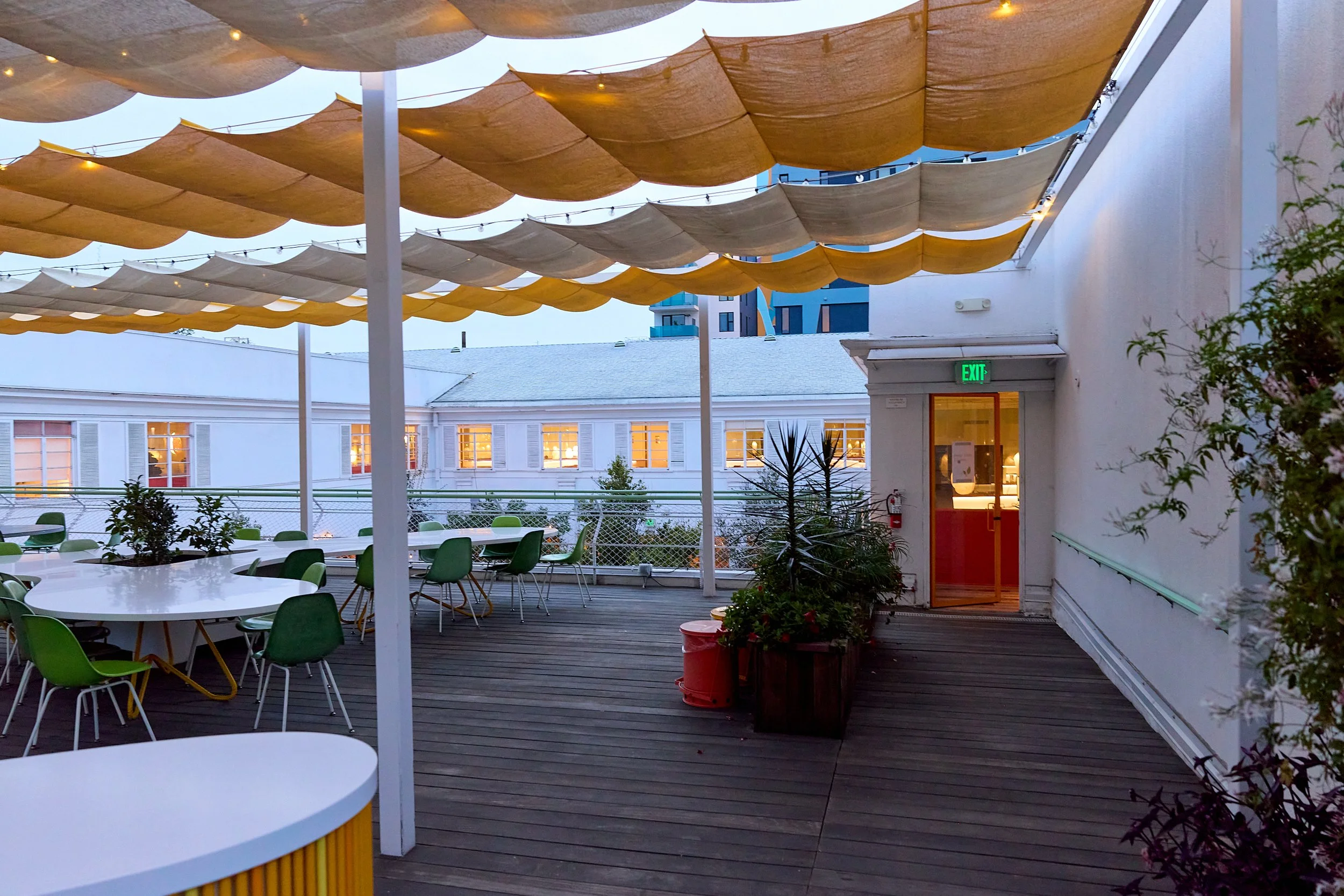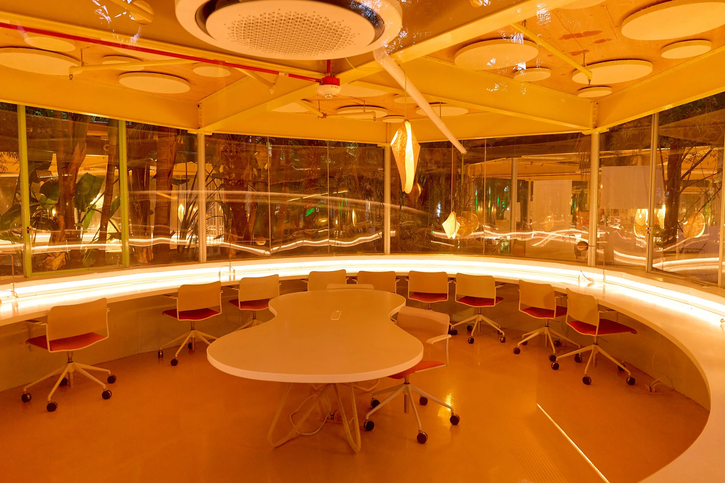 Two-acre creative campus designed by Spanish architect Jose Selgas (SelgasCano), integrated into a historic 1960s Paul Williams Colonial Revival office building. 50,000 sq ft landscaped garden 60 individual curved acrylic, freestanding garden studio office pods Restaurant and bar Tree-covered patio courtyard with fountain Auditorium Meeting rooms and breakout spaces Private offices On-site bookshop Interconnected pathways throughout campus Architecturally distinct: Mid-Century structure paired with contemporary Bauhaus-influenced design and futuristic acrylic pod installations Extensive natural light, layered outdoor environments, and multiple self-contained zones within one controlled campus setting.