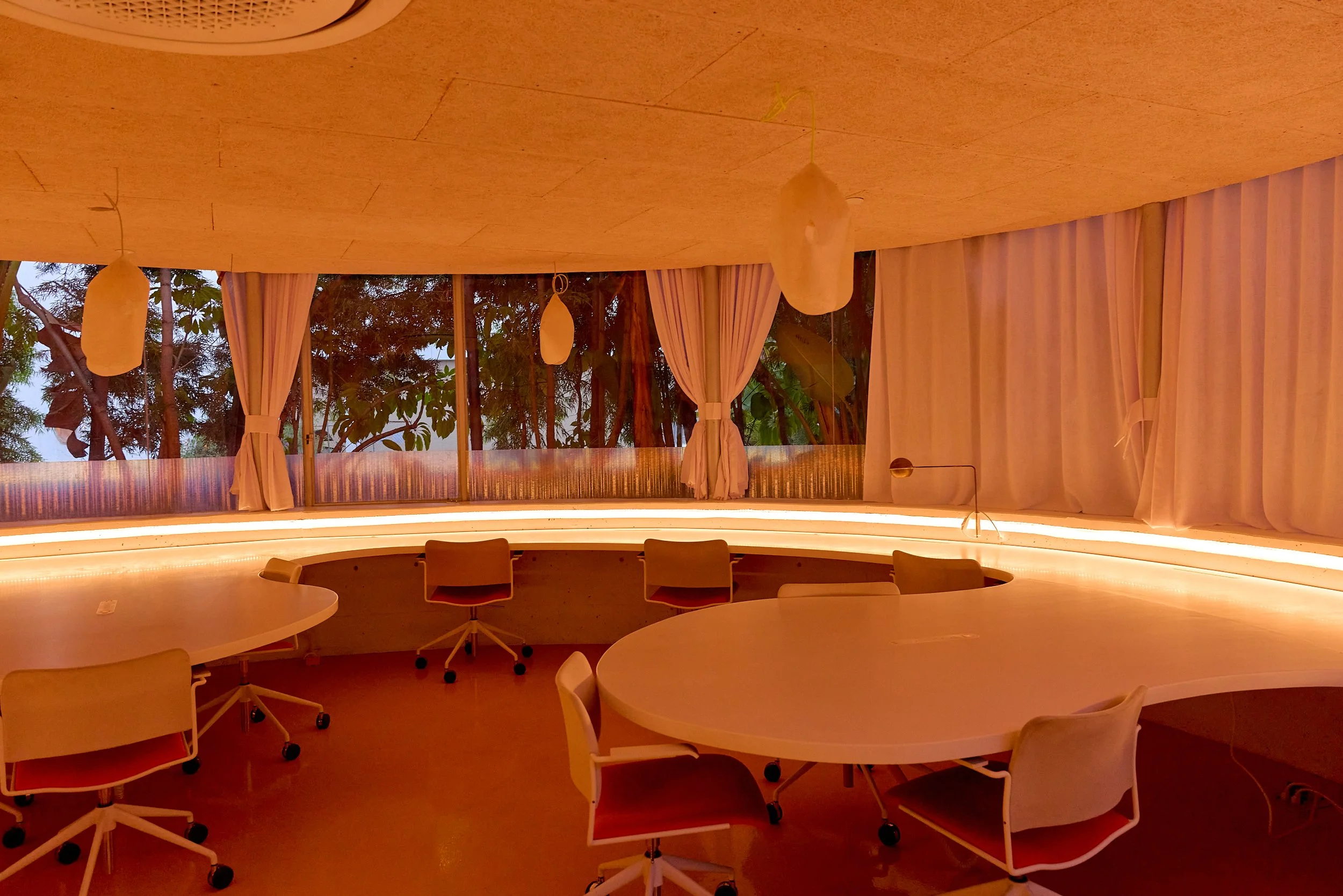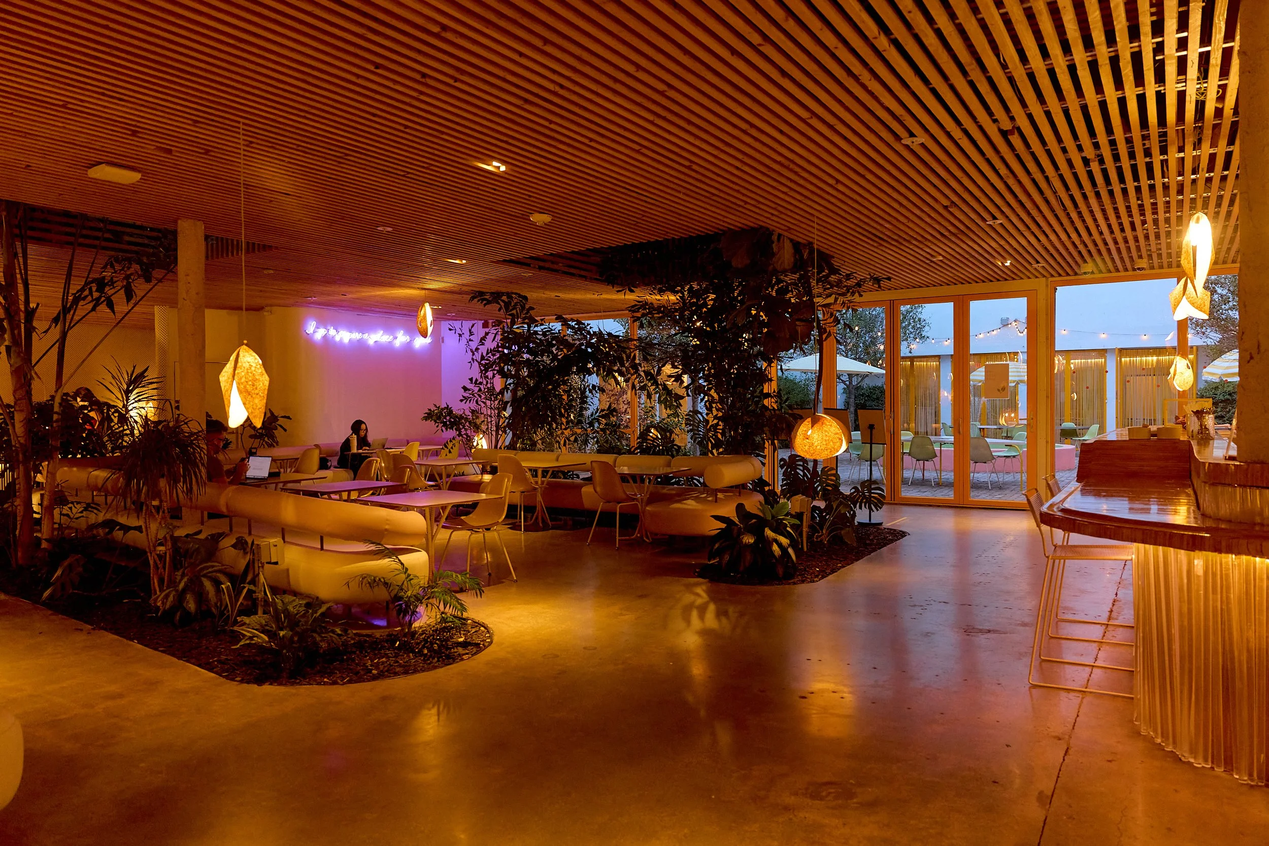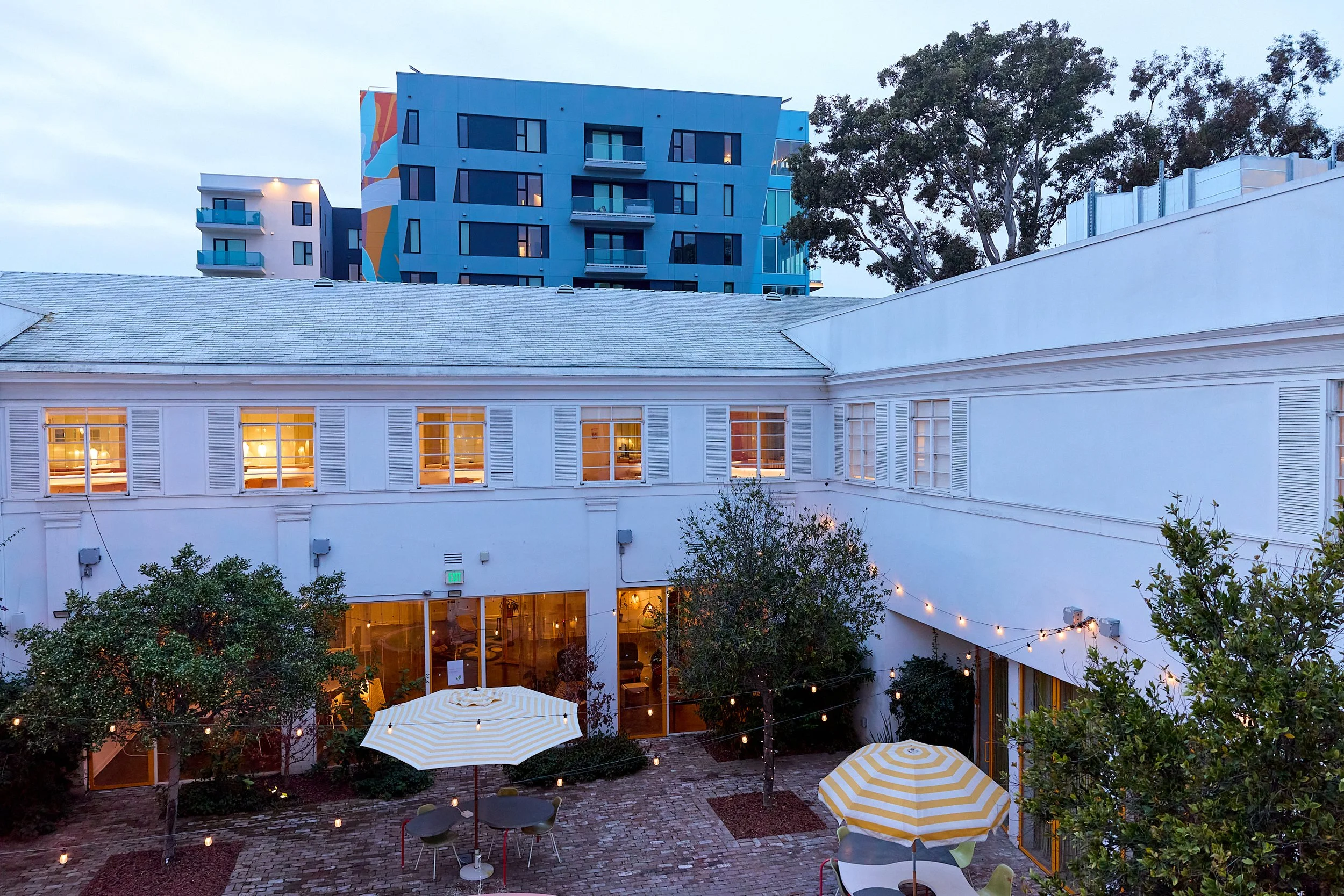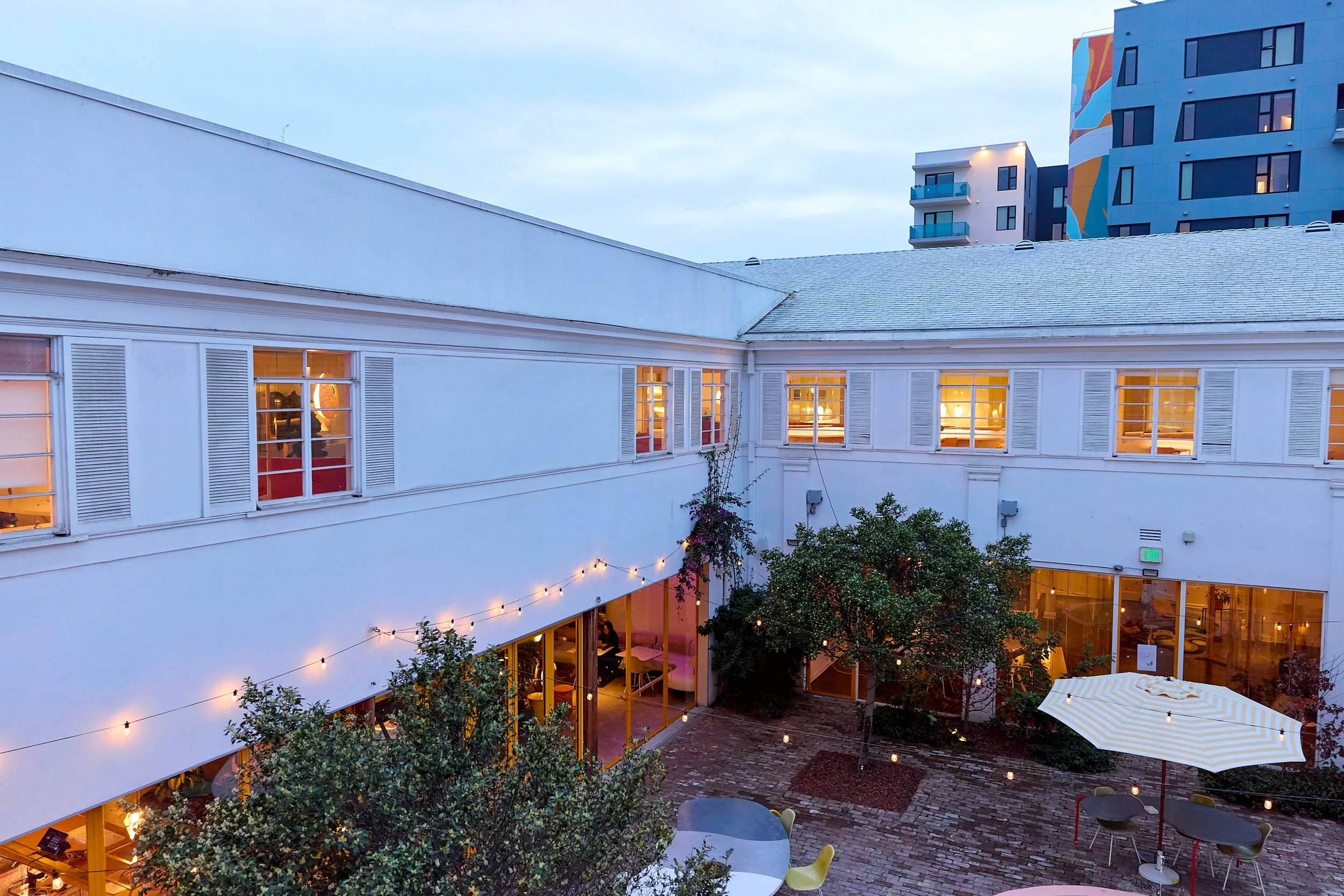 Two-acre creative campus designed by Spanish architect Jose Selgas (SelgasCano), integrated into a historic 1960s Paul Williams Colonial Revival office building. 50,000 sq ft landscaped garden 60 individual curved acrylic, freestanding garden studio office pods Restaurant and bar Tree-covered patio courtyard with fountain Auditorium Meeting rooms and breakout spaces Private offices On-site bookshop Interconnected pathways throughout campus Architecturally distinct: Mid-Century structure paired with contemporary Bauhaus-influenced design and futuristic acrylic pod installations Extensive natural light, layered outdoor environments, and multiple self-contained zones within one controlled campus setting.