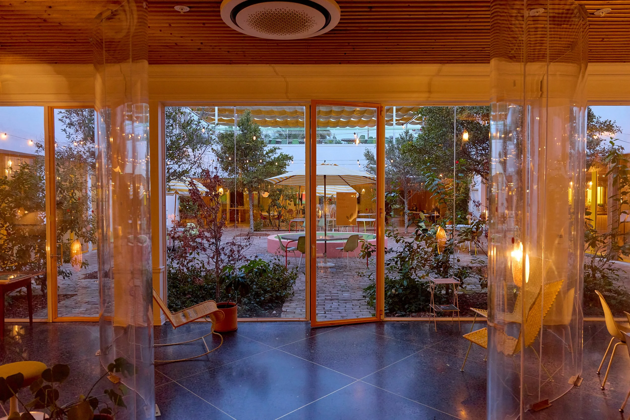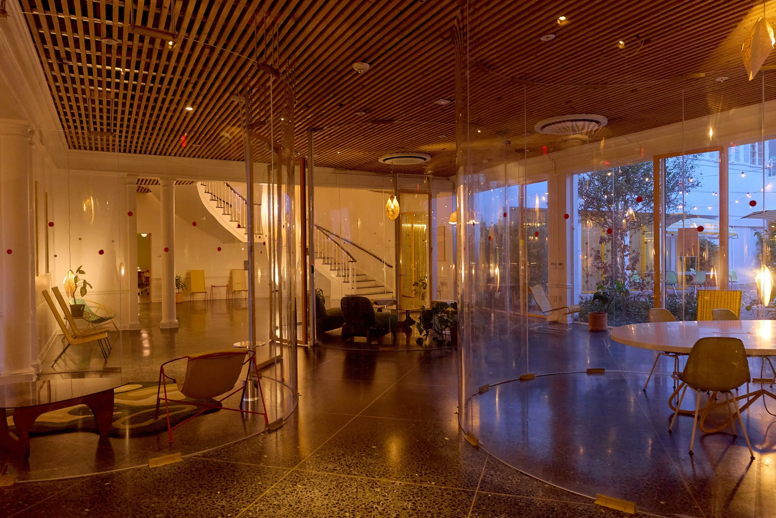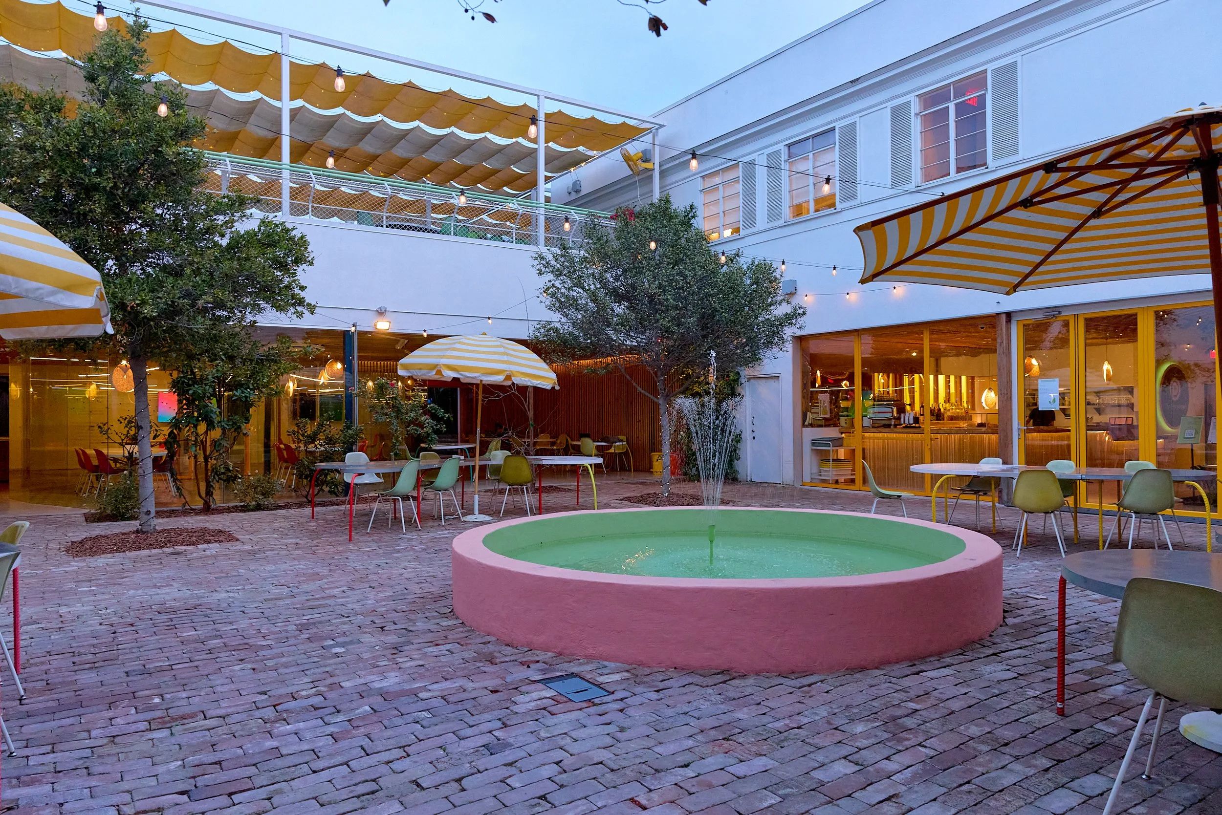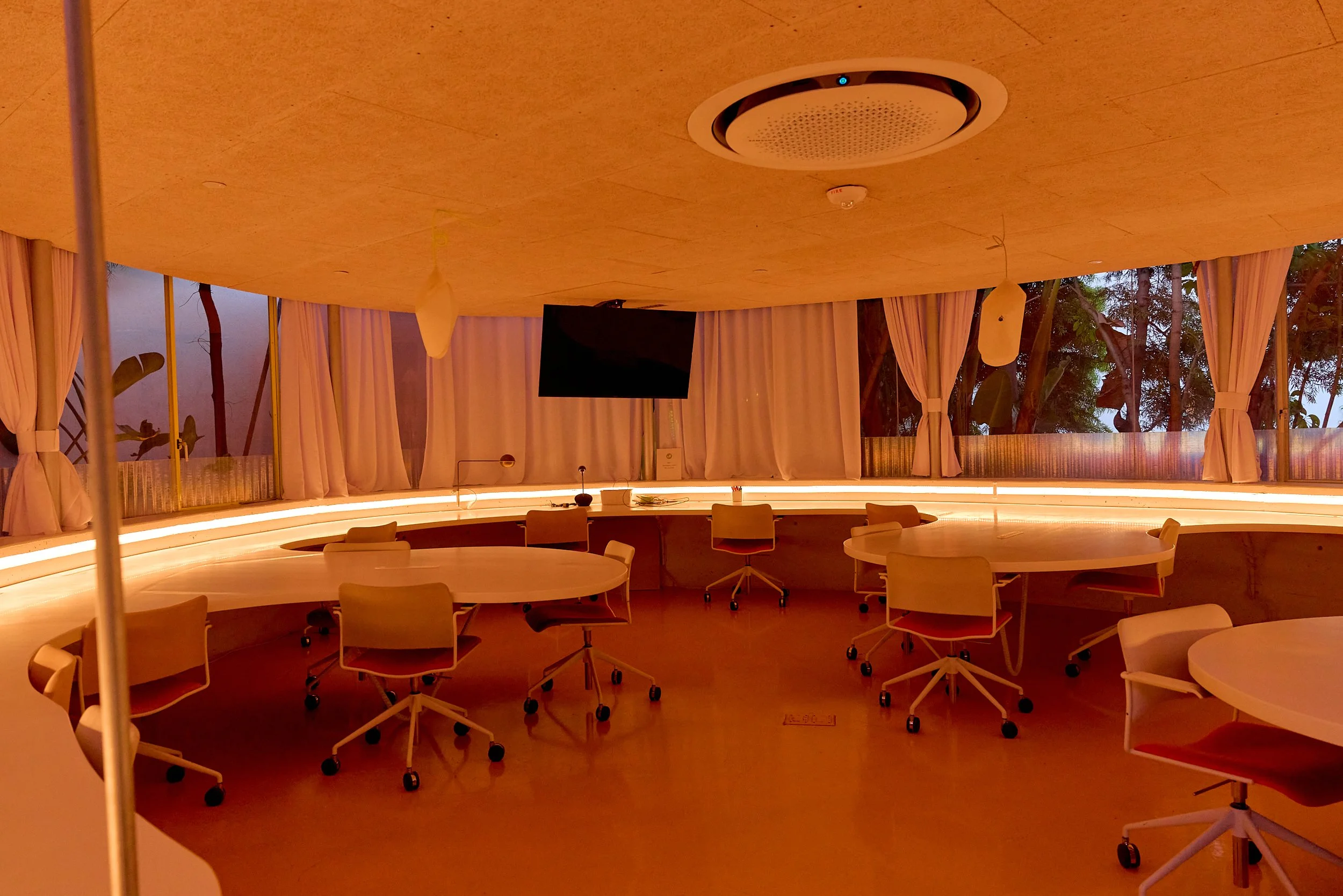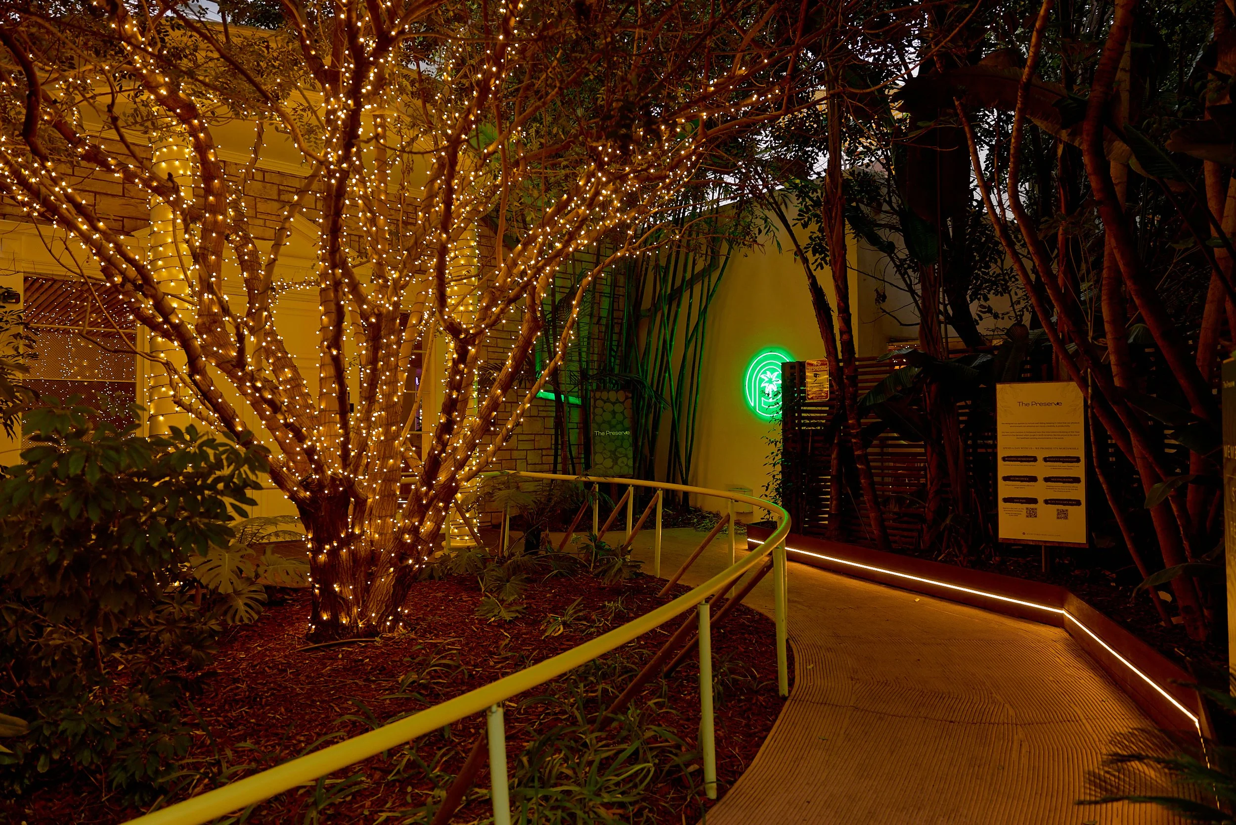 Two-acre creative campus designed by Spanish architect Jose Selgas (SelgasCano), integrated into a historic 1960s Paul Williams Colonial Revival office building. 50,000 sq ft landscaped garden 60 individual curved acrylic, freestanding garden studio office pods Restaurant and bar Tree-covered patio courtyard with fountain Auditorium Meeting rooms and breakout spaces Private offices On-site bookshop Interconnected pathways throughout campus Architecturally distinct: Mid-Century structure paired with contemporary Bauhaus-influenced design and futuristic acrylic pod installations Extensive natural light, layered outdoor environments, and multiple self-contained zones within one controlled campus setting.
